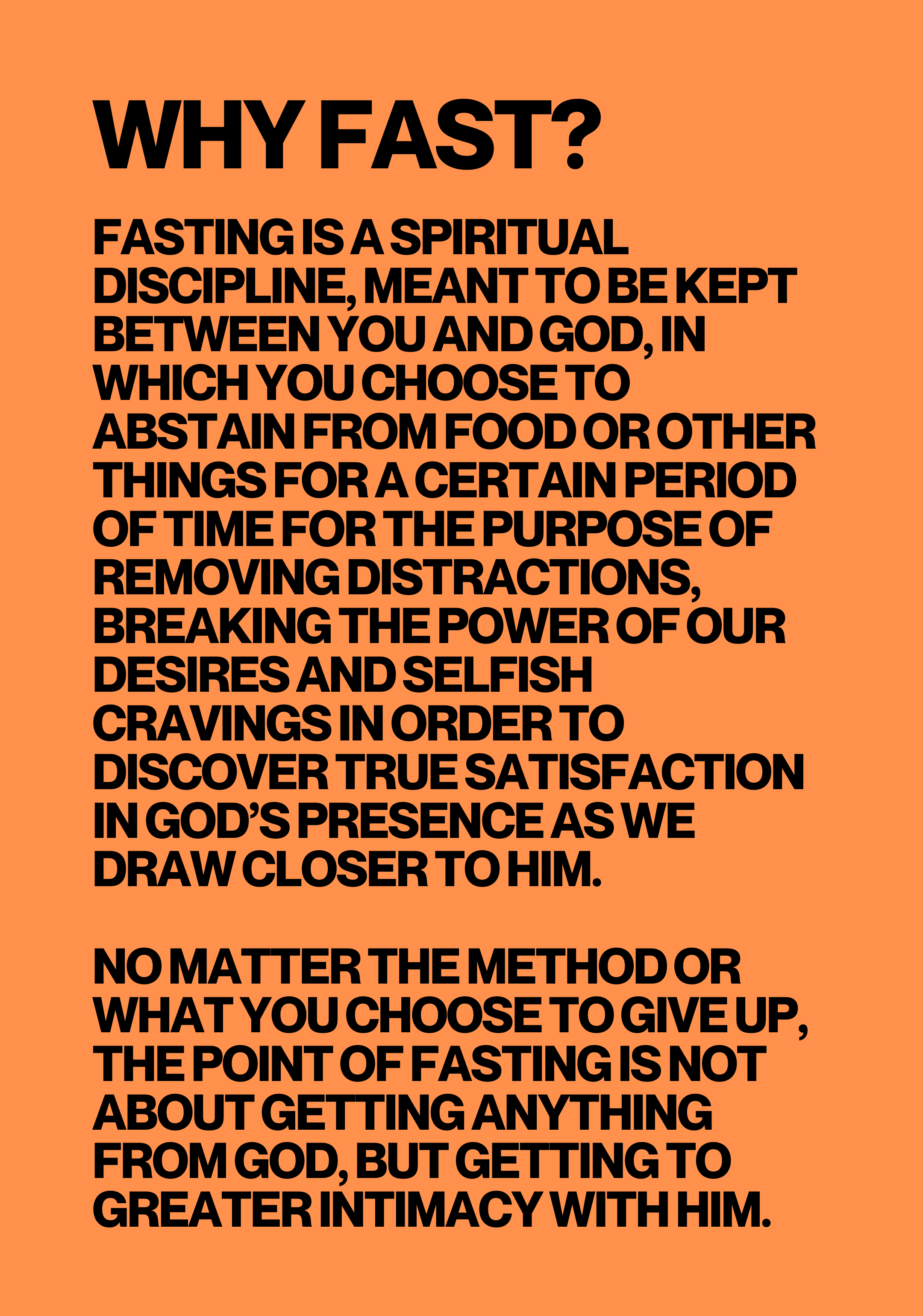 Fasting should be limited to a set time, especially when fasting from food, because extended periods of time without eating can be harmful to the body and fasting is not intended to punish the flesh or be reduced to a dieting method, but to redirect our attention to God. Some may not be able to fast from food due to a medical condition, but everyone can temporarily give up something in order to draw closer to God.